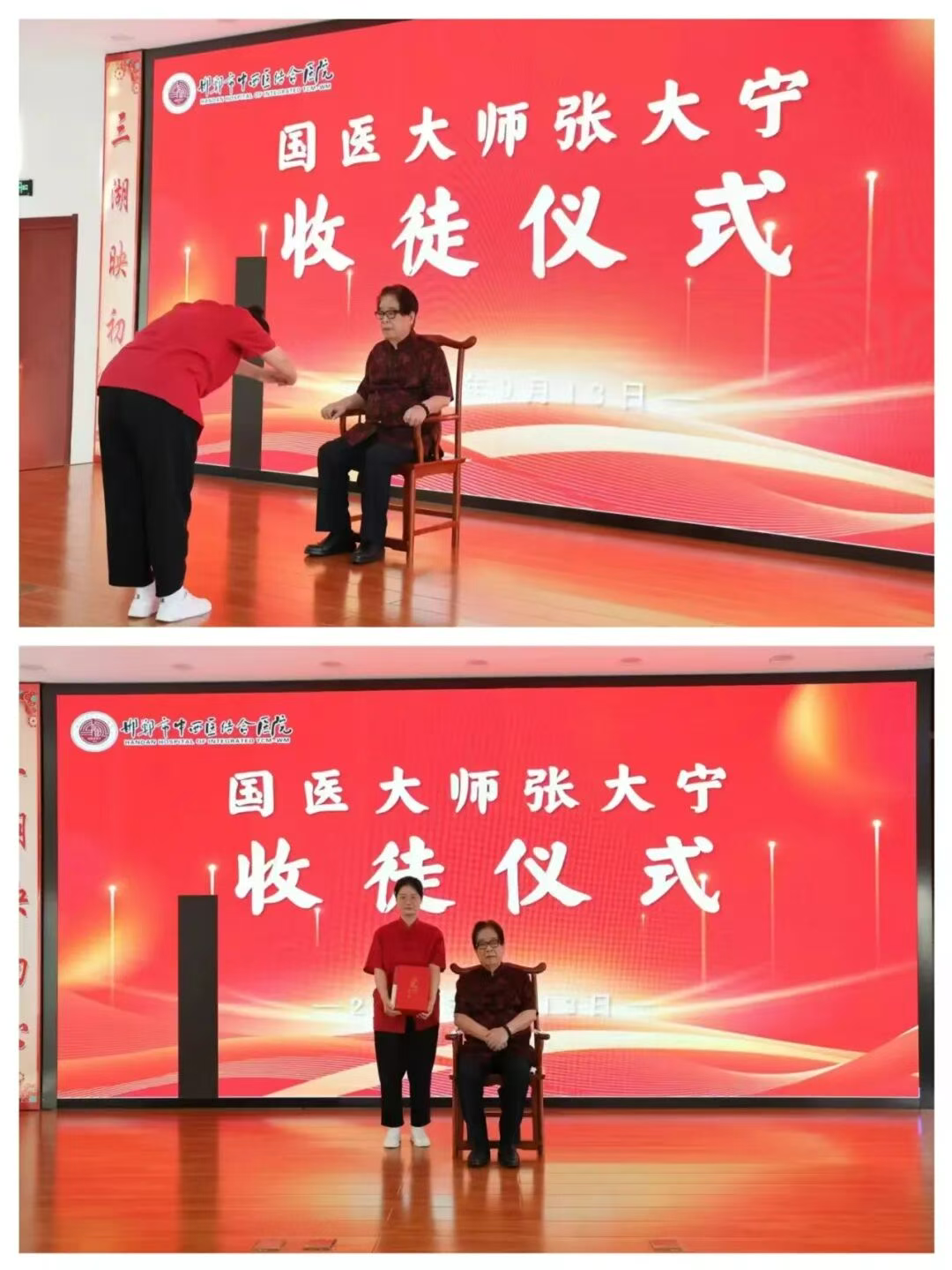 仪式上,肾内科中医师杨璐向张大宁行三鞠躬礼并献香茶,张大宁颁发拜师证书、赠送著作,缔结师徒关系。